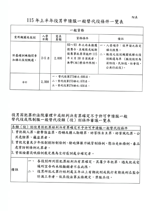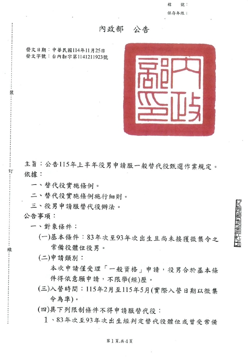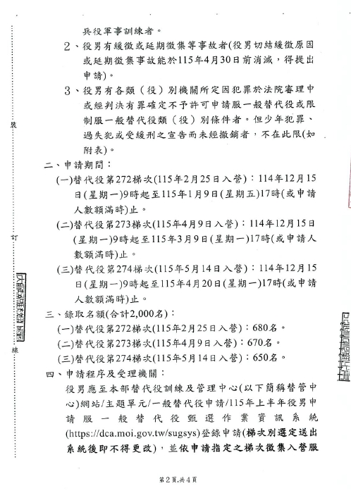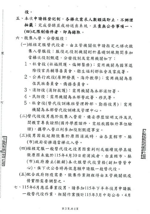 役男應至內政部替代役訓練及管理中心網站/主題單元/一般替代役申請/115年上半年役男申請服一般替代役徵選作業資訊系統(https://dca.moi.gov.tw/sugsys/)登錄申請(梯次別選定送出系統後即不得修改)並依申請指定之梯次徵集入營服役。