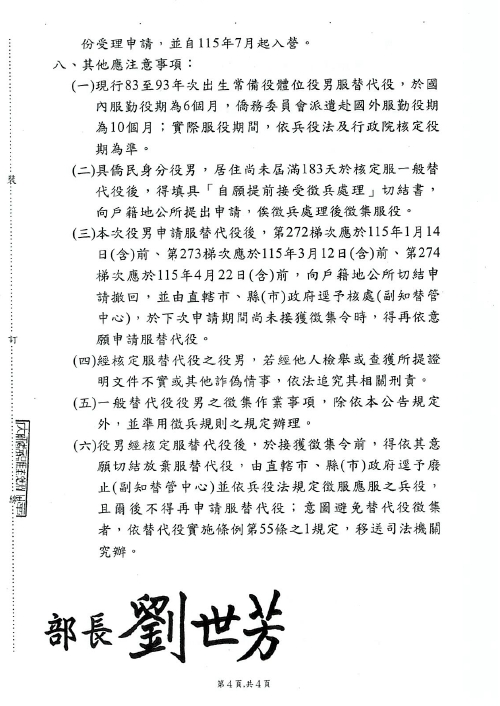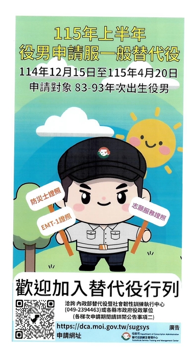 役男應至內政部替代役訓練及管理中心網站/主題單元/一般替代役申請/115年上半年役男申請服一般替代役徵選作業資訊系統(https://dca.moi.gov.tw/sugsys/)登錄申請(梯次別選定送出系統後即不得修改)並依申請指定之梯次徵集入營服役。
